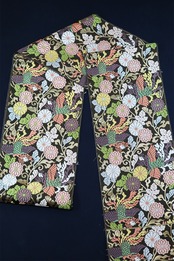 濡れ緯糸という濡らしたよこ糸で織る唐織の袋帯です。引き締まった張りのある生地に太い緯糸で柄を織り上げ文様がより強調されています。
