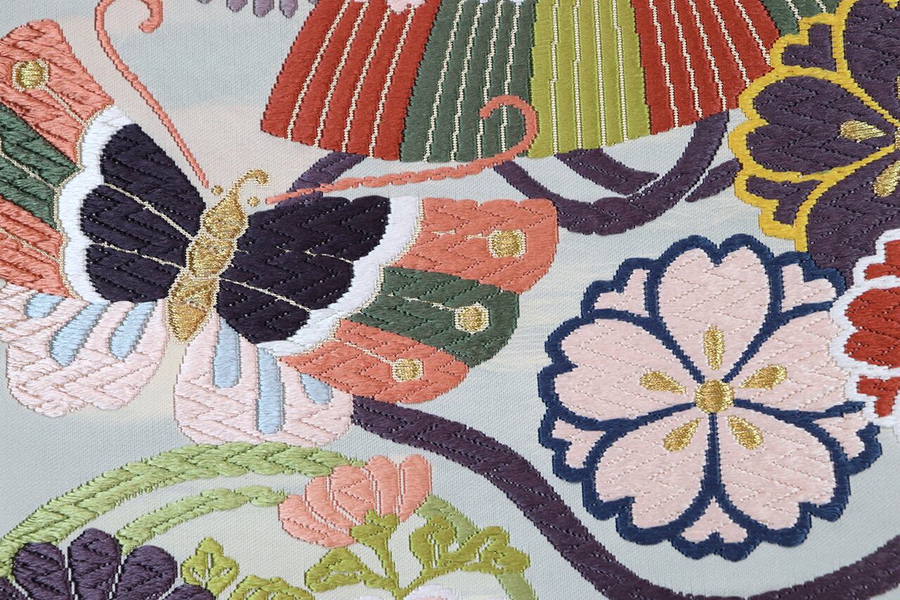 宝物である笠と桜、菊、藤などの花、それに蝶々まで華やかな配色で織り上げられています。
